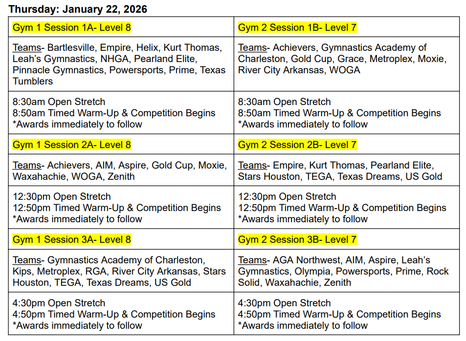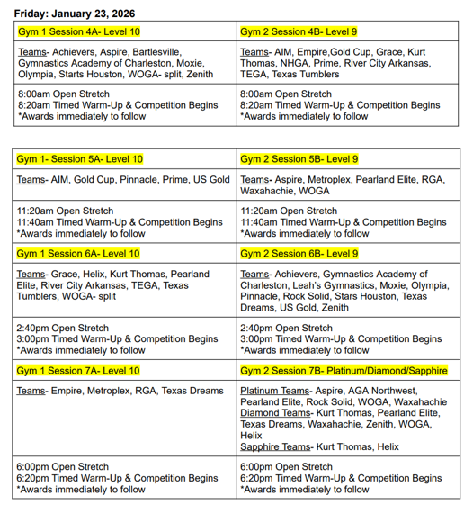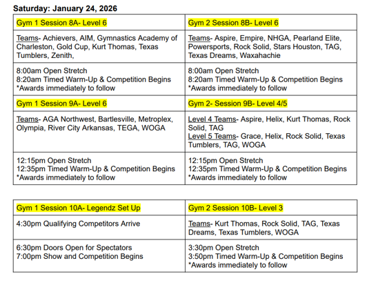 On Friday, January 23, 2026, all of the Level 9 & 10/Open sessions will take place. Separately, from each of the four Level 10/Open sessions, the gymnasts placing in the top 3 on bars, the top 3 on beam, and the top 3 on floor will qualify to perform on that one event. Coaches will submit event preferences for their gymnasts in the case a gymnast qualifies on more than one apparatus. In addition to these 36 Level 10/0pen gymnasts, the top-2-scoring All-Arounders in each of the three Level 9 sessions will comprise the final 6 members of each team. Combining the sessions, the 3 highest Level 9 All-Arounders will qualify to perform on all 3 events (bars, beam & floor), with rank 4th-6th All Around becoming the important role of team alternates who will be part of the show’s cast during the Q&A portion of Legendz Classic. (Ties will be broken utilizing USAG rules.)