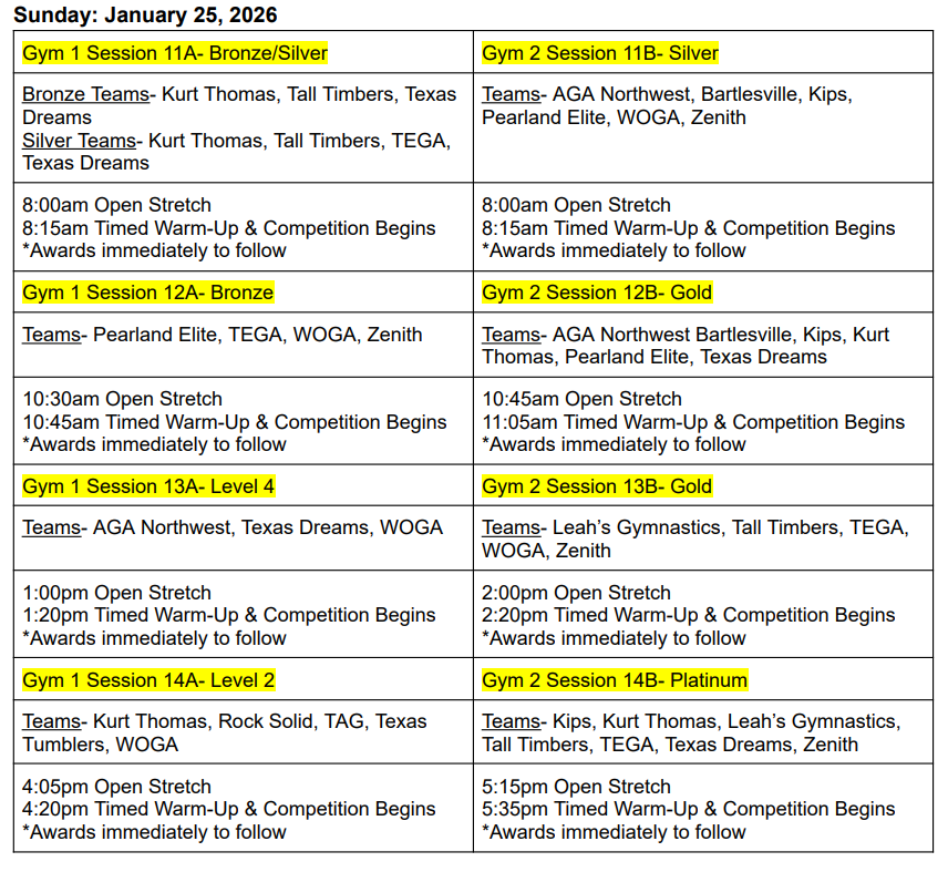 2026 Kim Zmeskal’s Texas Prime Meet Schedule